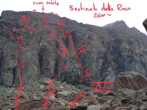 Avvicinamento: Da devero seguire in direzione nord il sentiero per Binn. Giunti in vista dalla scaletta metallica per la Bocca dell Rossa, deviare a destra e, seguendo la base della parete, raggiugnere una zona con un tetto propio sopra alla base; circa 100 mt a destra del grande diedro. Individuare il punto in cui il tetto divente meno strapiombante. Chiodo visibile.